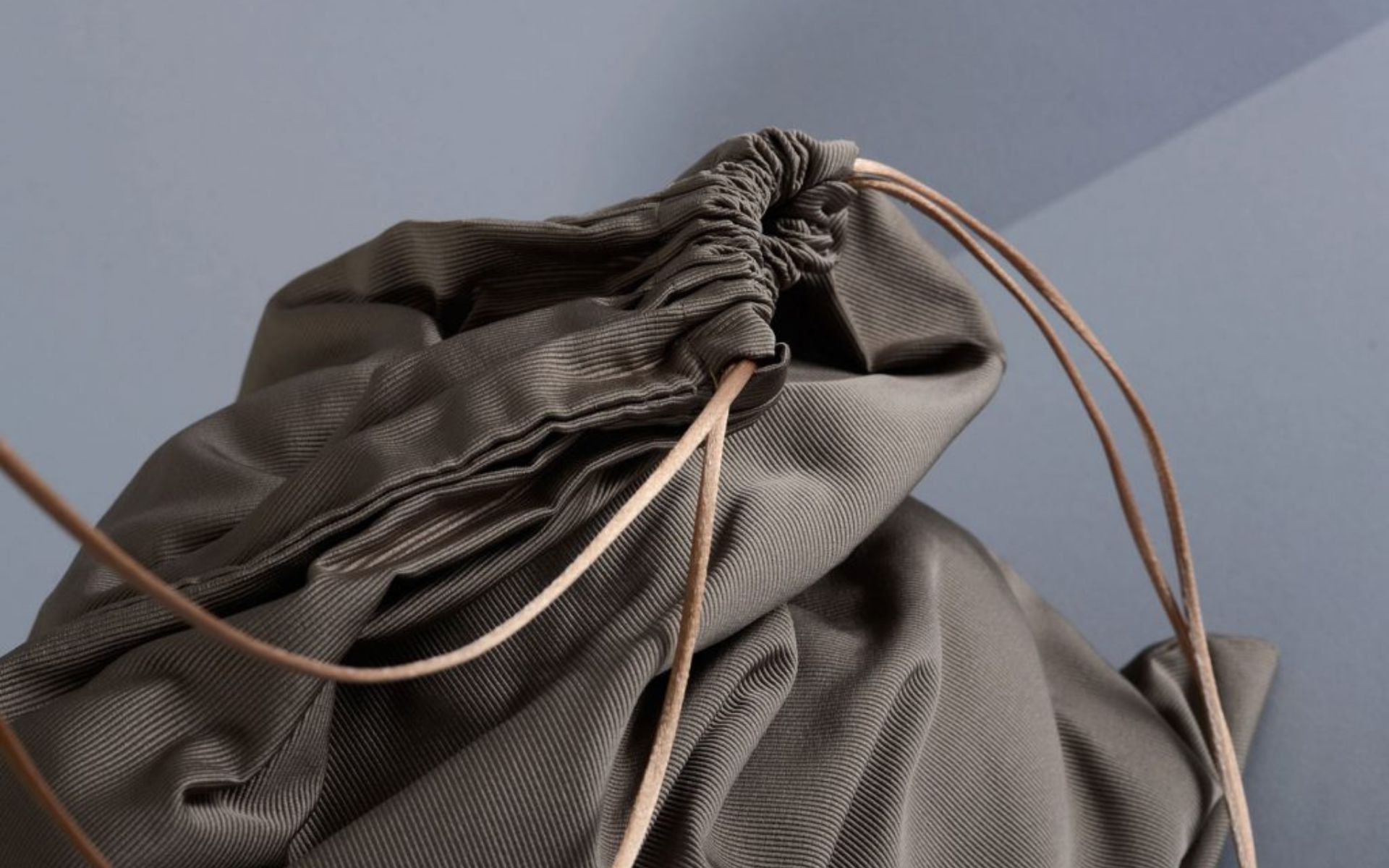 采用深灰细条纹肌理面料,自带哑光高级质感,搭配浅棕皮质抽绳,束口褶皱设计利落有型。可收纳外套、浴袍等大件织物,防尘防潮的同时尽显简约格调,支持定制尺寸与印标,是极简风收纳与高端布草配套的优选。