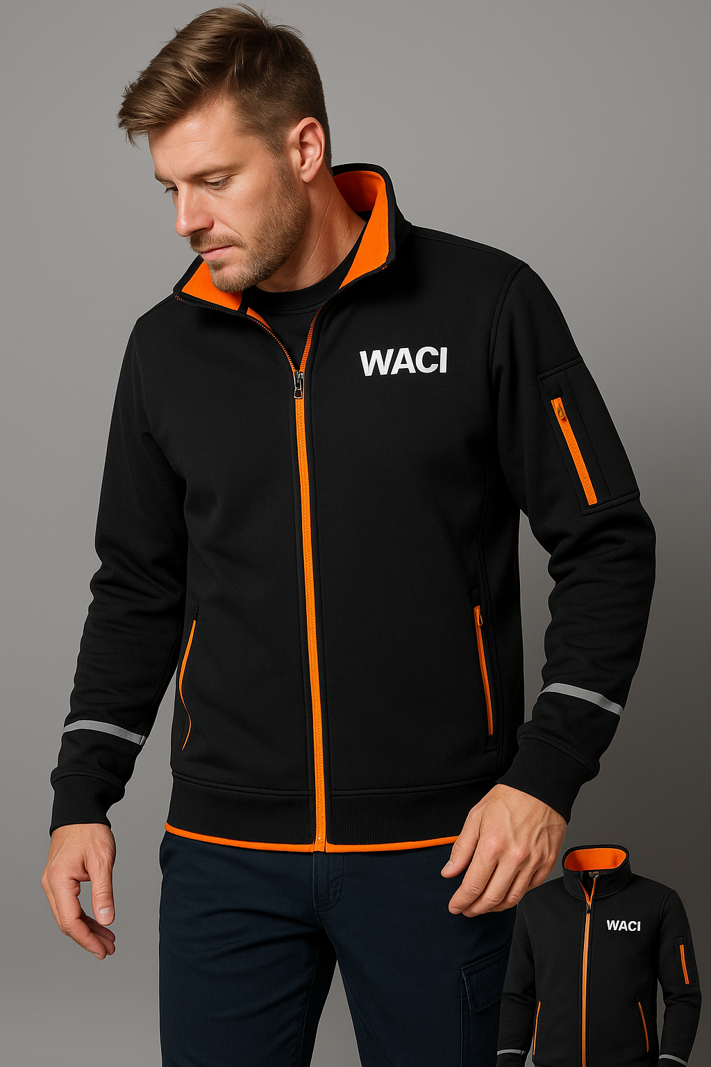 Giubbotto da lavoro in contrasto nero-arancione, con strisce riflettenti, logo vistoso, pratico e durevole, adatto a ogni contesto lavorativo.