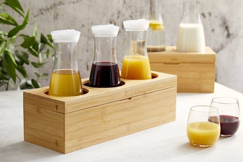 Supporto in bamboo con tre fori, per bottiglie e caraffe