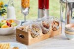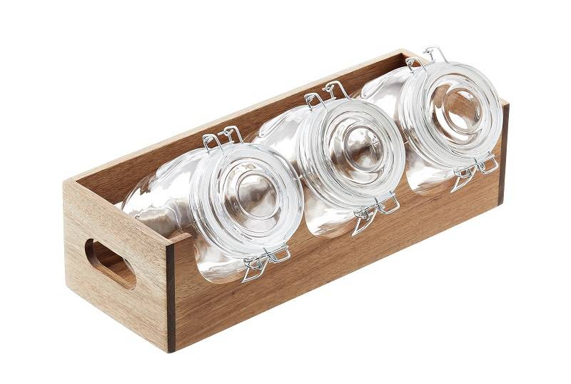 Supporto in acacia con tre jar da 1 litro a chiusura ermetica, per cereali, confetti, semi e molto altro