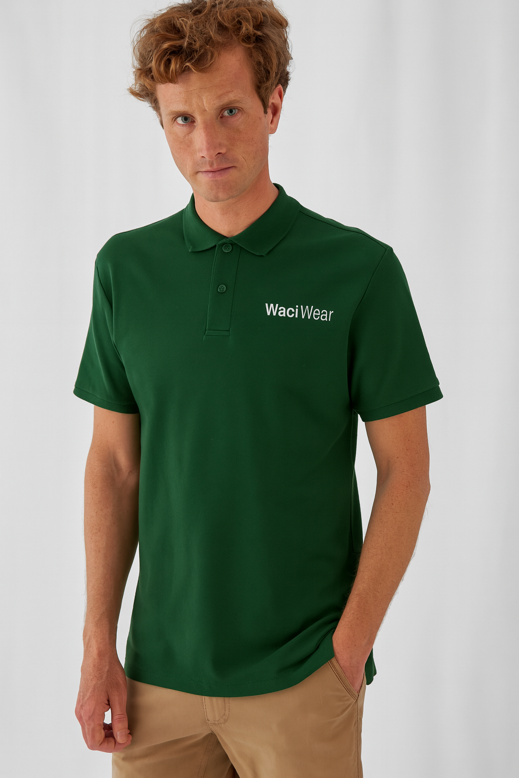 Polo verde scuro per fiere, logo minimal, comoda e ben fatta, adatta a mostre in contesto business casual.