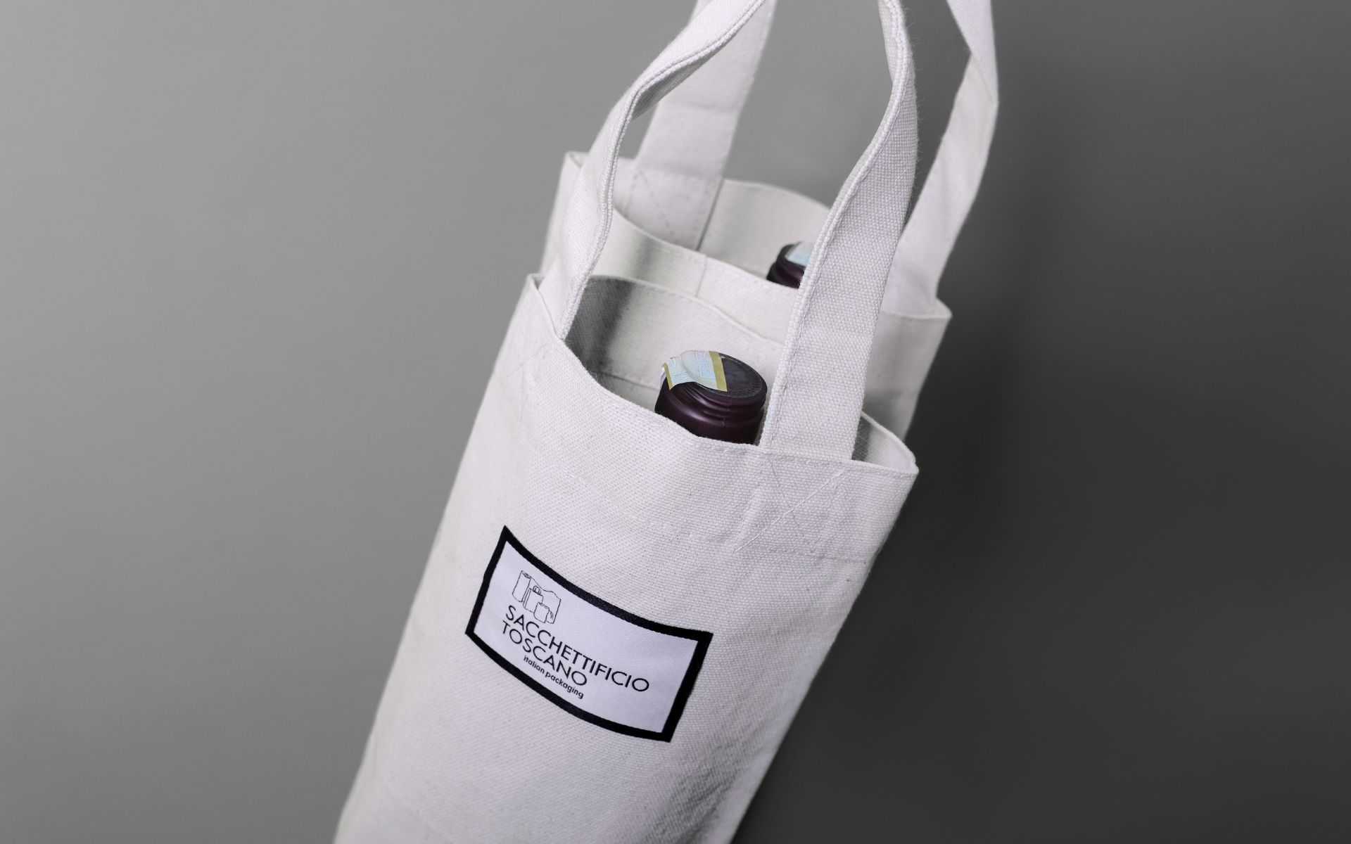 Borsa per vino in tela eco-compatibile, con design a doppio scomparto per una protezione sicura della bottiglia, semplice e funzionale, ideale per regali e uso personale.